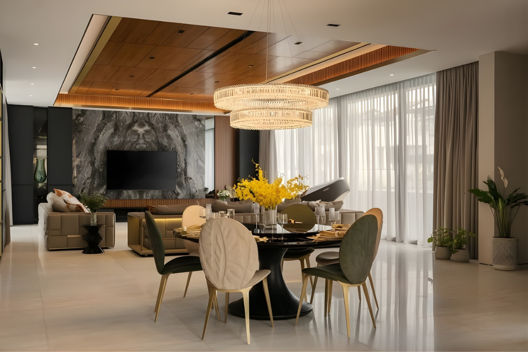 Tọa lạc tại một khu đô thị sinh thái ven sông cao cấp ở Hải Phòng, căn biệt thự sở hữu mặt bằng liên thông hoàn toàn giữa phòng khách – bàn ăn – bếp. Do vậy cần cung cấp đủ độ sáng cho một không gian rộng rãi, giải phóng sức nặng của trần gỗ, và tạo sự liền mạch thị giác từ trong nhà ra khu vực sân vườn.